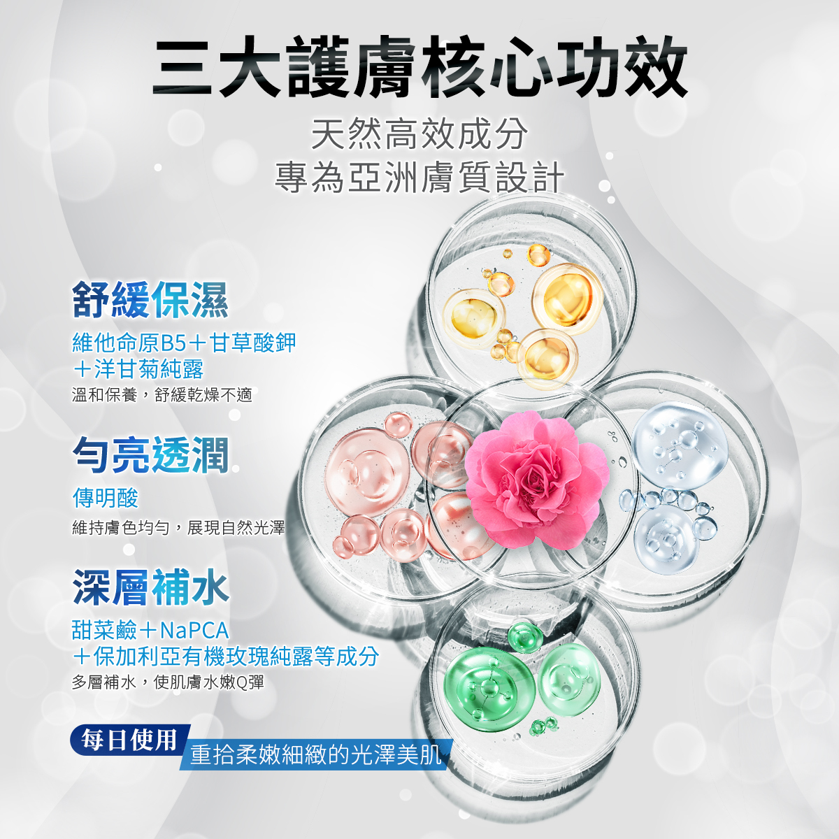 ✦  深層補水:甜菜鹼、NaPCA、保加利亞有機玫瑰純露等成分,多層補水,使肌膚水嫩Q彈